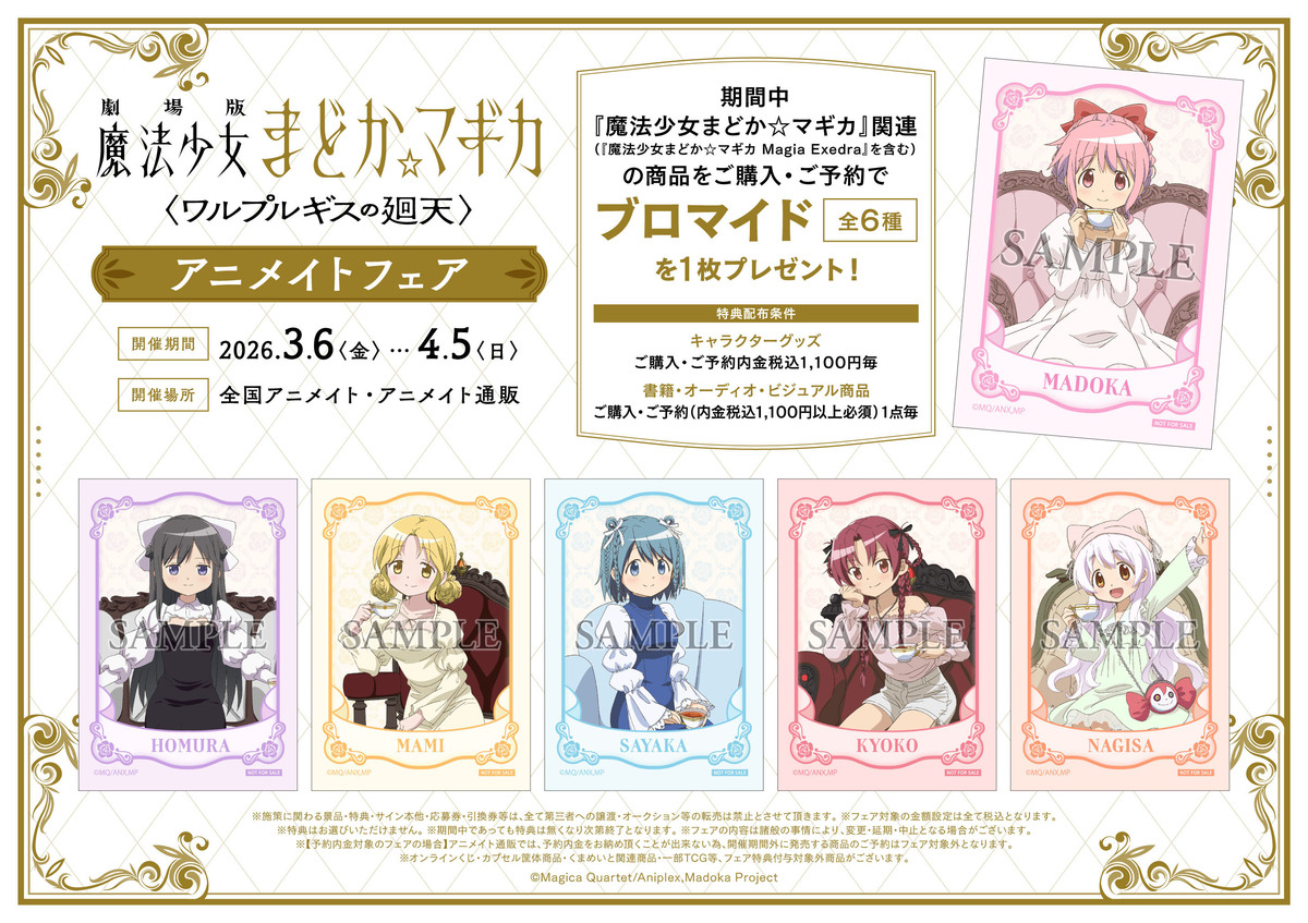 期間中『魔法少女まどか☆マギカ』関連(『魔法少女まどか☆マギカ Magia Exedra』を含む)のキャラクターグッズをご購入・ご予約内金1,100円(税込)毎、書籍・オーディオ・ビジュアル商品をご購入・ご予約(内金1,100円(税込)以上必須)1点毎にブロマイド(全6種)を1枚プレゼント!